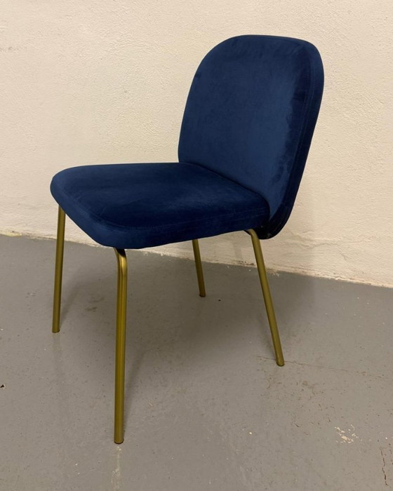 Set of 4 luxurious royal blue velvet chairs with gold legs. The chairs are comfortable and have an elegant appearance, making them a stylish addition to almost any room. Signs of wear: some scratches/damage to the legs.