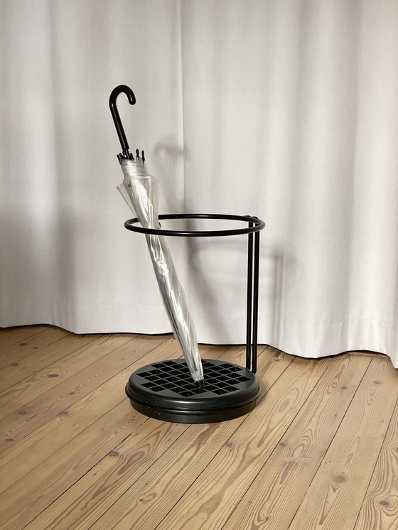 Vintage "Goccia" umbrella stand with a plastic drip tray and metal frame. Designed by Boccato, Gigante & Zambusi for Magis. Shows signs of wear.