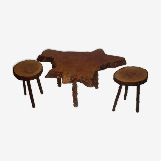Coffee or lounge table with 2 stools, all made of Mahogany wood (slices of the tree) in the 70s, rare and exceptional piece, note 1 of the stool legs is not original. A few small bark chips, see photo.