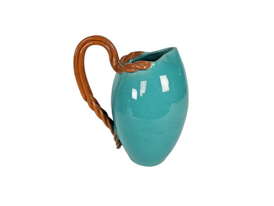 Turquoise blue jug with white turned handles.