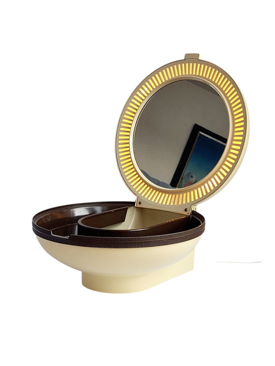 Made of cream-colored plastic. Glass mirror. Beautiful space age, UFO shape.