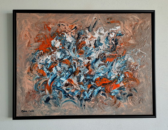 Experience the vibrant expression of 'Freedom and Peace' by Manou Claire. This abstract painting combines dynamic brushstrokes with a harmonious blend of orange, light terracotta, brown, blue, and white, creating a sense of movement and tranquility. Perfect for any space that could use a touch of artistic flair. Add this unique piece to your collection and let it be a conversation starter in your interior. Acrylic paint on canvas finished with satin varnish and a black wooden floating frame. Dimensions: 60 x 80 cm. Including frame: 64 x 84 cm. With certificate of authenticity and signed by the artist.