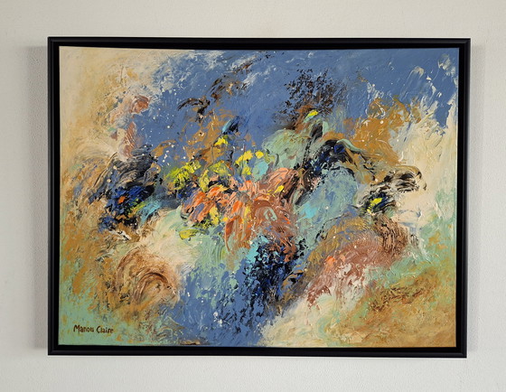 Experience the enchanting beauty of 'Nebula' by Manou Claire. This abstract painting on canvas captures a dynamic interplay of colors and textures, perfect for any modern space. The vibrant shades of grey-blue, pistachio green, and ochre yellow create a visual spectacle that draws attention and inspires. Add a touch of artistic flair to your interior with this masterpiece. Acrylic paint on canvas finished with satin varnish and a black wooden floating frame. Colors: grey-blue, pistachio green, ecru, ochre yellow, light terracotta, dark brown, black, yellow, copper, gold, and a touch of orange. Dimensions: 60 x 80 cm. Including frame: 64 x 84 cm. With certificate of authenticity and signed by the artist.
