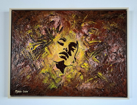 Discover the expressive power of 'She' by Manou Claire. This painting captures the essence of feminine beauty and mystery in an explosion of warm colors. The bold brushstrokes and use of texture create a dynamic and compelling artwork that brings any space to life. (She, based on lyrics by Charles Aznavour). Acrylic paint on canvas finished with satin varnish and a plain wooden floating frame. (Black floating frame available). Colors: various shades of brown, light terracotta, and yellow. Dimensions: 60 x 80 cm. Including frame: 64 x 84 cm. With certificate of authenticity and signed by the artist.