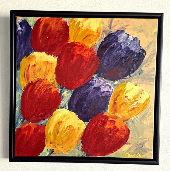 Experience the vibrant colors and expressive brushstrokes of "Tulips" by Manou Claire. This abstract painting captures the essence of tulips in an explosion of red, yellow, and blue-purple. Perfect for adding a touch of color and energy to any room. Acrylic paint on canvas with a black wooden floating frame. Dimensions: 50 x 50 cm. Including frame: 54 x 54 cm. With certificate of authenticity and signed by the artist.