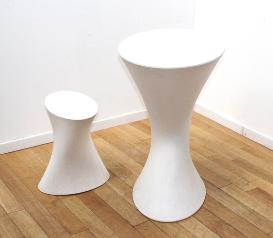 Side table and stool set by Marco Maran, Parri. Entirely in white plastic. Original design. Table height: 76cm Stool height: 44cm In fair condition. Perfect for all your outdoor spaces.