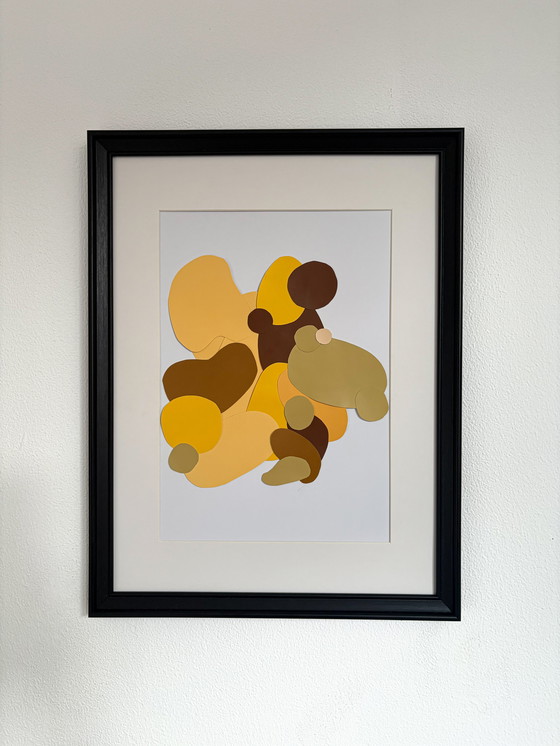 The artwork is built from softly overlapping paper shapes in warm tones of ochre, sand and muted earth colours. The subtle relief creates a gentle interaction between light and shadow, allowing the work to shift quietly throughout the day without losing its serene presence.