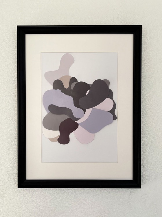 Handmade abstract collage composed of carefully cut and layered paper elements. The artwork features subtle relief and three-dimensional depth.
