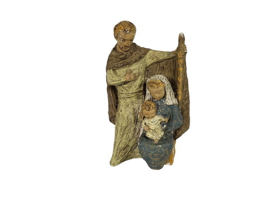 This beautiful statue of Mary, Joseph, and Jesus, signed by WF, is an authentic piece from the first half of the 20th century. Crafted from plaster, the statue exudes a classic charm that fits perfectly into a traditional interior. The warm brown and blue tones, combined with gold accents, give the statue a timeless appearance. This artwork is not only a tribute to religious iconography but also a valuable addition for any collector of historical statues. Contact us today for more information about this unique piece.