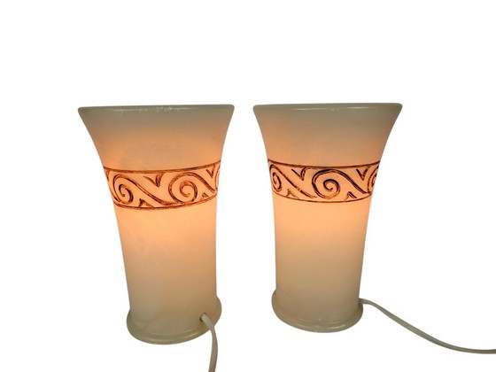 These lamps are made of real natural stone; alabaster. They provide playful light because the natural stone allows light to pass through. The lamps are equipped with an adjustable light switch so that the desired brightness can be set. The lamps have been tested and work properly. Light bulbs are not included.