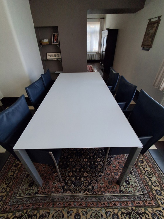 This table was purchased just a year ago and is still in perfect condition. It has a matte white glass top. It measures 220x100x76 cm.