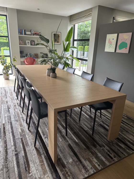 Beautiful table by Maxalto (B&B Italia), beautiful design with flat legs that change on each side. Size is 300 x 110 cm, easily seats 10 to 12 people. Slight water damage on table top only slightly visible under certain light. Finish: pale oak brushed.