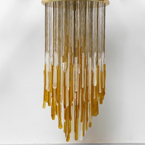 Illuminate your space with the exquisite elegance of this Mazzega Murano Glass Chandelier, a stunning piece of Italian design from the 1970s. This vintage chandelier features a cascade of golden and transparent Murano glass elements, each delicately suspended from a metal frame, creating a mesmerizing play of light and shadow.