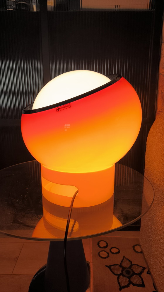 An iconic piece of Italian Space Age design, this Meblo “Clan” lamp—manufactured under license from Harvey Guzzini—features a sculptural silhouette and a hypnotic orange-to-white gradient that glows with ambient warmth.