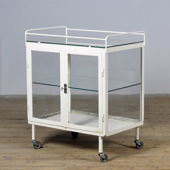 Crafted from sturdy iron and glass, the trolley was originally produced in Hungary in the 1940s. Its industrial design and functional form exude character and timeless charm. The glass panels and shelves make the trolley ideal for stylishly displaying items, while the metal frame provides a robust appearance. The casters add a playful and practical touch, making it easy to move. Perfect as a display cabinet, bar unit, or statement piece in an industrial, vintage, or eclectic interior.