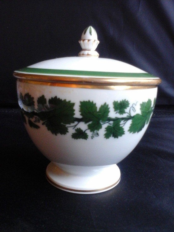 Porcelain sugar pot/bonbonbonière and lid from Meissen, Germany, "Green Ivy" design from the 1950s in perfect condition measuring 9cm high and 10.50cm wide.