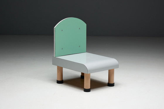 Playful and sophisticated, this Memphis-style chair captures the essence of postmodern design with its bold shapes and pastel shades. The backrest features a curved silhouette in a refreshing mint green, enhanced with subtle silver rivet detailing that adds a contemporary edge. The seat, finished in a glossy light grey laminate, offers a sleek and polished surface that contrasts beautifully with the backrest. Four sturdy cylindrical legs, crafted with a natural wood tone, are capped with black rubber accents, giving the piece a distinctive yet grounded presence. Perfect as a statement piece or a functional work of art, this chair embodies the Memphis movement’s ethos: bold, unconventional, and endlessly captivating.