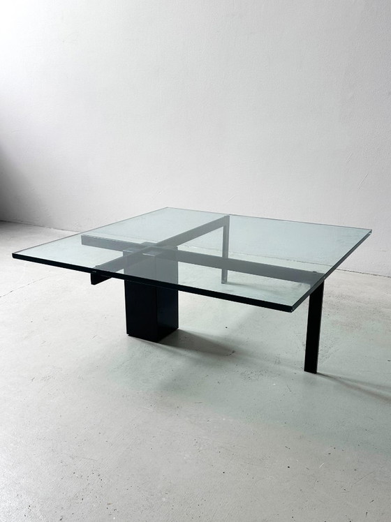The central granite base features a metal frame that forms a cross in the base, an interesting detail. 1 cm thick glass top, 100 x 100 cm. This extraordinary design, no longer in production, will surely appreciate in value.
