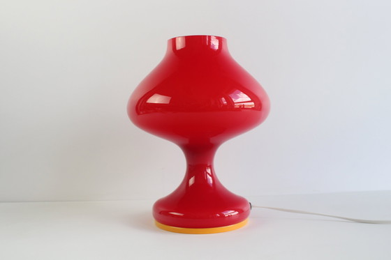 Bold and expressive glass vase designed by Štěpán Tabera for the Škrdlovice Glassworks in the 1970s. Featuring a dynamic, organic silhouette and vibrant orange-red glass with a contrasting yellow base edge, this piece exemplifies the innovative and playful design language of Czech postwar glass art. A striking and rare collectible from one of Škrdlovice’s distinctive designers. New cabling 1x60W, E27 or E26 bulb Re-polished Original condition US Adapter included.