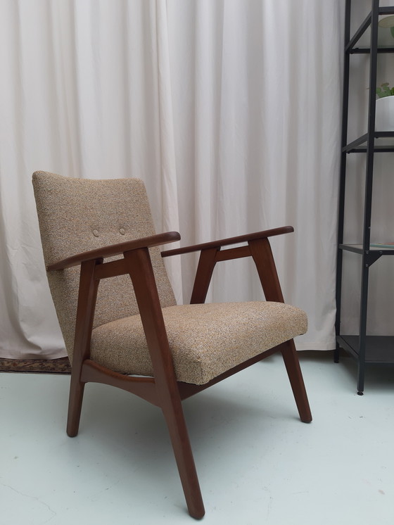 Mid - Century Armchair Newly upholstered in strong upholstery fabric. Woodwork completely restored.