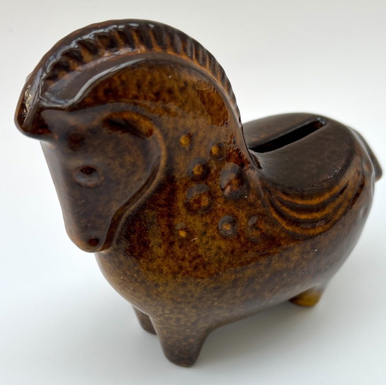 Decorative ceramic money box in the shape of a stylized horse, likely an Italian piece from the Mid-Century design period, circa 1960s–1970s. The figure exhibits typical characteristics of the Italian studio ceramic style, often associated with the designs of Bitossi Ceramiche.