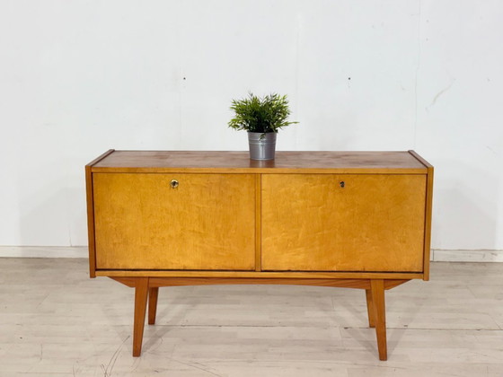 For sale is a beautiful mid-century modern chest of drawers from the 1960s. This piece of furniture impresses with its clean lines, elegant wood grain, and characteristic angled legs.