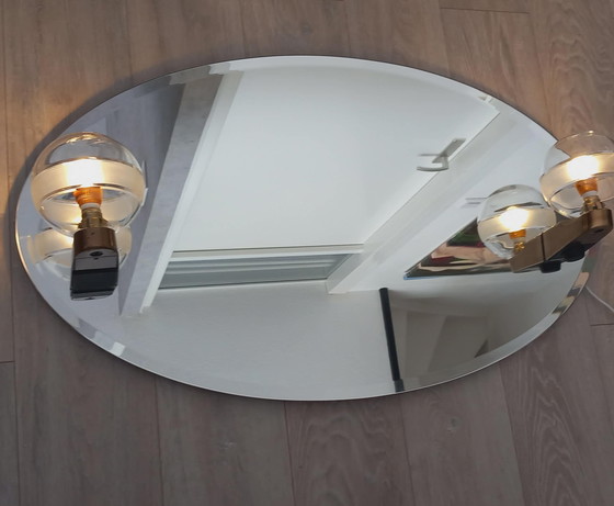 This elegant cut crystal bathroom mirror by T+L Royal from the 1960s adds a touch of mid-century modern style to any room. Featuring two spherical Murano-style glass lights mounted on solid brass arms, this mirror emits a warm and inviting glow. Ideal for vintage design enthusiasts looking for a unique and functional piece for their interior.