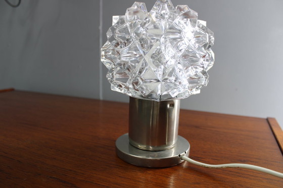 Distinctive Mid Century table lamp produced in Czechoslovakia during the 1970s, originating from the renowned glassmaking region of Kamenický Šenov. The design features a highly sculptural, faceted crystal glass shade mounted on a minimalist chrome-plated metal base.
