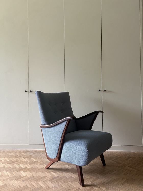 The chair features a sleek design with a comfortable blue textile upholstery from Aristide and elegant palisade wooden armrests and legs. Its Mid-Century Modern style makes it a perfect addition to any contemporary or vintage-inspired living space. The chair is not only stylish but also offers great comfort, making it an ideal choice for relaxation.
