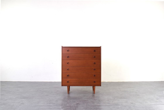 This teak chest of drawers was manufactured in Denmark in the 1960s. The furniture has been professionally and carefully restored by removing old coatings, staining and finishing with varnish. The chest of drawers has six capacious drawers. Each of the drawers is finished with solid teak handles. The legs are made of solid teak.