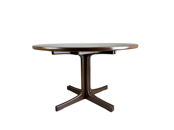 We offer a beautiful dining table probably made by J.O. Carlsson from the 1950s for sale. The design is by Karl Erik Ekselius and is a timeless example of the Scandinavian Midcentury era. Unfortunately, the shelves are missing, which is why the table can no longer be extended. The wood has been treated with a hard-wearing dark brown decorative wax, which protects the wood sustainably and for the long term. Condition: Very good, almost new condition with hardly any signs of use. (see pictures) Manufacturer: J.O. Carlsson Designer: Karl Erik Ekselius Country of origin: Sweden Epoch: 1950s, Mid - Century Material: Teak, Dimensions approx.: Width: 120cm, Height 73cm, Diameter: 120cm Product ID: 2490