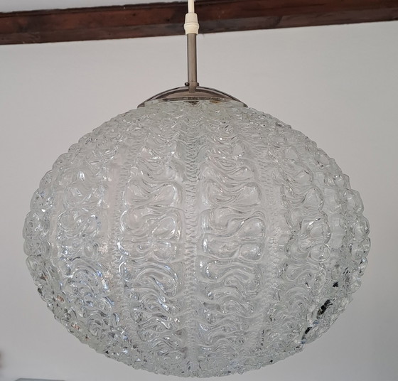 This exquisite mid-century Doria ceiling lamp from the 1960s embodies the unmistakable design of the Space Age. The frosted glass pendant light exudes an elegant transparency that adds a special touch to any room.