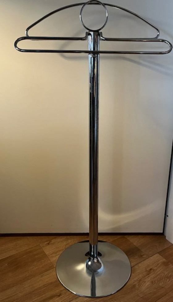 Mid-century valet stand. Made of sturdy chrome-plated metal. For hanging clothes, but also perfect as a towel rack in the bathroom. Like new with hardly any signs of wear. Sturdy, weighted base plate, 30 cm. Height: 1 meter, 45 cm wide, and 17 cm deep. Not suitable for shipping by mail, so pickup only in Utrecht. Bidding starts at €45.