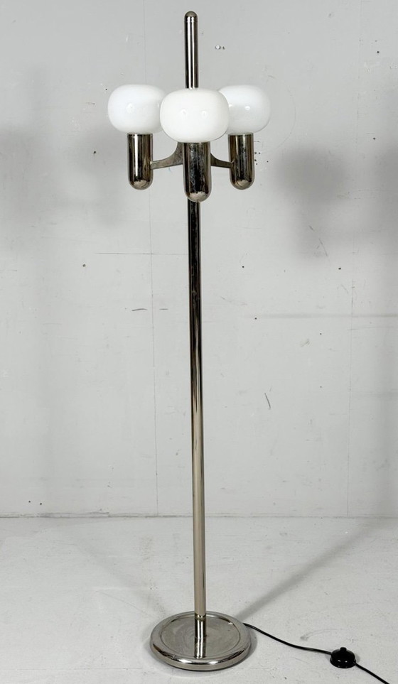 Mid-century floor lamp, Italy, 1970s, chrome-plated metal frame with opal glass shades, three light sources,