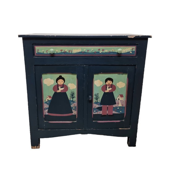 Mid-century green wooden sideboard from France. Hand-painted with folk art details, one drawer and two doors. There is some paint wear around the edges, as shown in the photos. This gives it a beautiful vintage look.