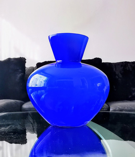 Bring a touch of Italian flair to your interior with this beautiful mid-century vase in a striking cobalt blue. Partially white on the inside, this vase is a real eye-catcher and adds a touch of elegance and style to any room. When the vase is exposed to light, it constantly changes color.
