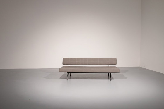 This elegant sofa bed designed by Rito Valla for IPE Bologna in the 1960s is a beautiful example of Italian mid-century modern thinking, where smart functionality meets refined aesthetics. At first glance it presents itself as a clean-lined, understated sofa with a light visual presence thanks to its metal frame and balanced proportions. With one smooth and intuitive movement, it transforms into a bed, making it an ideal solution for both everyday living and occasional guests. Reupholstered in a soft grey melange fabric, the piece feels contemporary while fully respecting its original character. Its thoughtful design and high-quality construction reflect the innovation and craftsmanship that made Italian furniture of this era so influential and desirable.