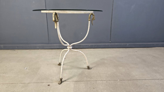 Beautiful white wrought iron base with brass clawfeet and swan shaped table top supports.