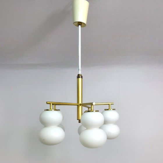 This beautiful mid-century lamp from the 1960s is a real eye-catcher in your interior. With its elegant combination of frosted glass and brass, it exudes a timeless charm that fits perfectly in both modern and vintage settings. Imagine this lamp illuminating your living room or dining room with a soft, warm glow, creating a cozy atmosphere.