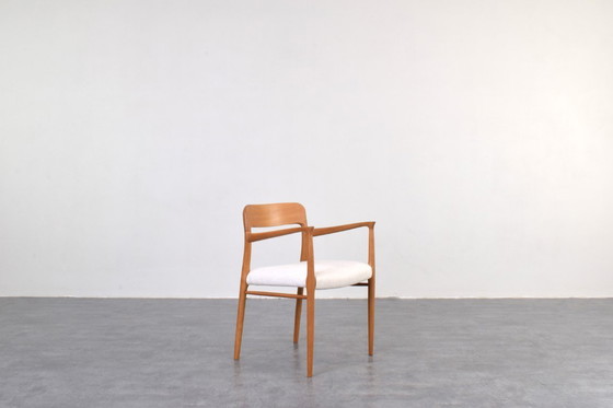 This chair was designed in the 1950s by the Danish designer Niels Otto Møller and produced by the Danish factory for J.L. Møllers. The armchair frame is made of solid oak wood and has been professionally and carefully restored by removing old coatings, staining and finishing with varnish. The seat has been reupholstered with a beige fabric made of a mixture of linen, cotton and viscose, resembling in its texture the materials originally used in the 1960s. The upholstery sponge was also replaced.