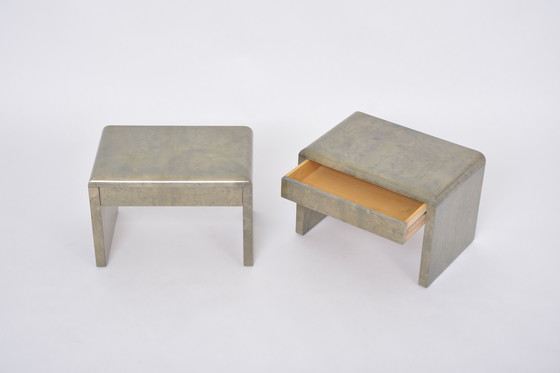 Pair of bedside tables or nightstands designed by Aldo Tura and produced in Italy approximately in the 1970s. Each table has a wood structure covered in Aldo Tura's signature style parchment in tones of light and darker green. The top is beautifully shaped with rounded edges, giving the tables an elegant and soft touch. The tables each have one drawer.