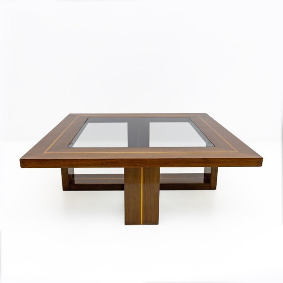 Gorgeous Italian coffee table in Mid-Century Modern style. Walnut veneer with maple inlays, smoked glass center top. Fully restored and shellac polished.