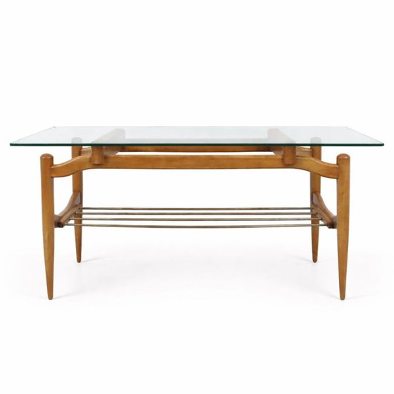 Mid Century Modern style coffee table from the 1950s with a restored beech wood structure and glass top.
