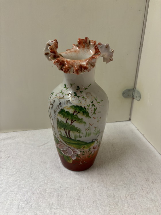 This exquisite mid-century opaline glass vase is a testament to timeless elegance and craftsmanship. Its delicate opaline finish is beautifully complemented by intricate hand-painted floral and landscape motifs, making it a captivating centerpiece for any room.