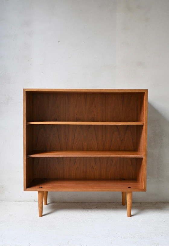 Stylish mid-century bookcase crafted from warm teak veneer. The design features clean lines, tapered wooden legs, and an open layout. Perfect for displaying ceramics, books, or collectibles. A timeless piece of furniture that is both functional and decorative.
