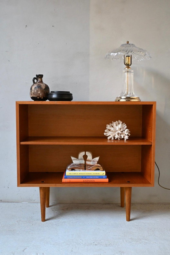 Open vintage cabinet with clean lines, characteristic of Scandinavian design from the 1960s and 1970s. A minimalist yet stylish cabinet made of teak veneer with tapered wooden legs. A timeless piece that fits into any interior.