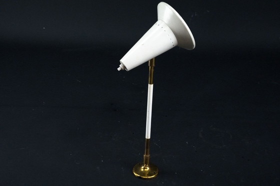 Visible signs of age and use consistent with its period. There are scratches and areas of lacquer loss on parts of the cone, as well as a natural patina on the brass elements, enhancing its authentic vintage appeal. Fully functional with EU standard wiring, easily adaptable to US standards upon request.