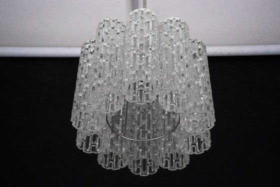 Elegant Mid-Century pendant light crafted in Italy during the 1960s, featuring a refined composition of Murano glass elements and a sleek chrome structure. The combination of high-quality materials and timeless design makes this piece a perfect addition to any vintage or contemporary interior.