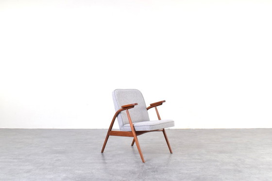 This very rare armchair model B6028 was produced in the 1960s in Poland by Fabryka Mebli Giętych in Radomsko, which also produced furniture for Ikea at that time. The frame of the armchair is made of bent beech wood, which has been professionally and carefully restored by removing old coatings, staining and finishing with varnish. The seat and backrest are newly upholstered in gray fabric. The upholstery sponge was also replaced.