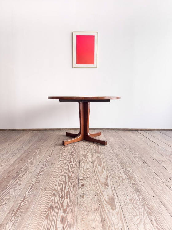 Hochwertiger runder Esstisch aus Teakholz, gefertigt in Dänemark in den 1960er Jahren. Der Tisch überzeugt durch seine außergewöhnlich schöne Maserung und eine sehr solide, handwerklich anspruchsvolle Konstruktion. Besonders hervorzuheben ist der skulptural gearbeitete Mittelfuß, der sich nach unten elegant verjüngt und in vier kräftige Tischfüße übergeht. Die kantig ausgearbeiteten Fußenden stehen bewusst im Kontrast zur runden Tischform und verleihen dem Design eine markante architektonische Note.